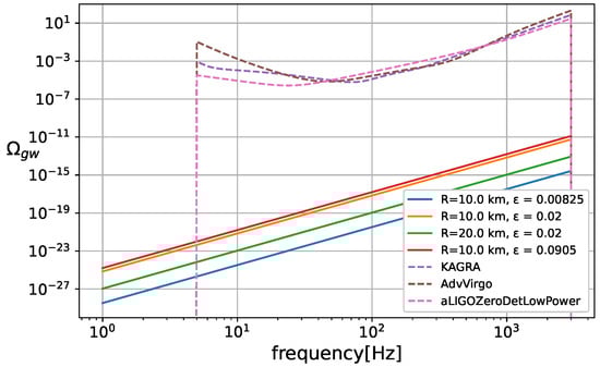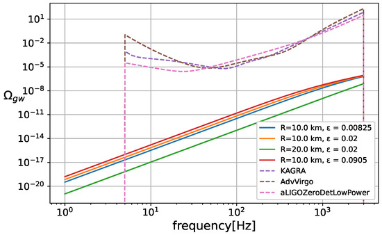 for different parametric preferences for the magnetar, produced SGWB high frequency model of the poloidal field configuration. The free parameters are and R, respectively. Furthermore, R is in km, as shown in the figure.