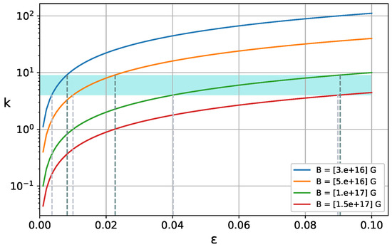 The dimensionless parameter versus the ellipticity for the magnetars with different strengths. The only free parameter here is magnetic field , same as in Figure 1. The parametric values are shown in the figure. The range of for being a realistic stellar model for each strength is marked by dashed lines.
