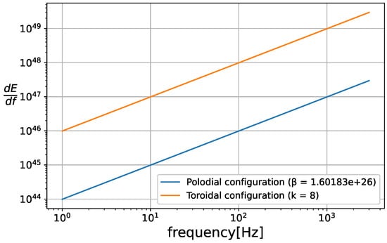 The expected evolution of the GW energy spectra emitted by the magnetars for different field configuration with frequency for a specific parameter’s space. Overall, the energy spectrum tends to increase rapidly as frequency increases. The orange and blue lines represent the results calculated by involving parameters I = 10 kg km, R = 10 km, = 0.02.
