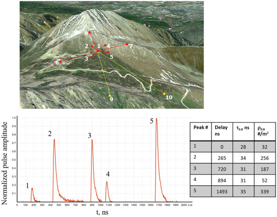Figure 1. (top): Aerial view and geometry of H10T instrument with location of 10 detectors, adapted from Beznosko et al., 2019 [4]; (bottom): A typical MME event recorded on 6 April 2018 by H10T instrument at point , adapted from Beznosko et al., 2019 [4]. All pulses are recorded at a single detection point. Delay times, the width of each peak in ns, and the particle density per within are also shown in the table. - 2.