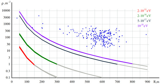 Figure 2. Solid lines: the particle density distribution in simulated EAS disk versus distance from axis for different energies shown by different colours, depending on energy of the CR. Blue dots: cumulative particle density for each bimodal pulse vs. distance to EAS axis, adapted from Beznosko et al., 2019 [4]. - 3.