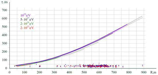 - The manifestation of the “pulse width puzzle” is as follows. On Figure 3 we show the simulated EAS disk width versus distance from axis for different energies shown by solid lines in different colours. As explained above the thickness of the EAS pancake increases with the distance from the core. Therefore, the pulse width must also increase correspondingly as shown by sold lines on Figure 3 for different energies. It is not what actually observed by H10T: all MME events show similar duration of the pulse width on the level of (20–35) ns irrespective to the distance to the AES axis. This observation is in dramatic conflict with conventional picture as outlined above.