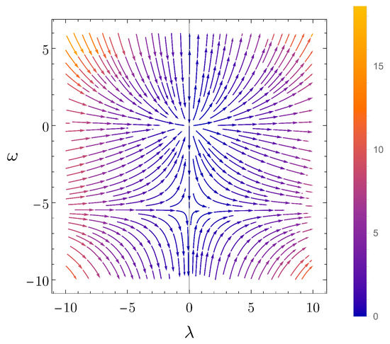 Flow of one-loop quadratic gravity in the subspace. The arrows point toward the IR. In this setting, two non-trivial fixed points are present, and the Reuter fixed point is the one with the smaller absolute value [178].
