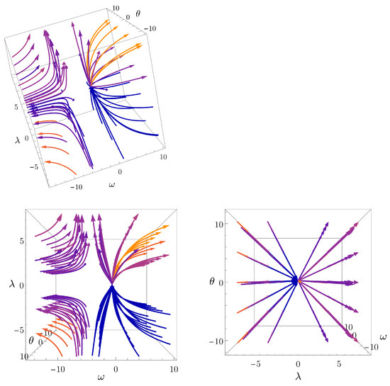 Flow of the classically marginal couplings in one-loop quadratic gravity. The arrows point towards the IR, and different viewpoints are shown to better visualize the flow. The color coding of the arrows is identical to that of Figure 1.
