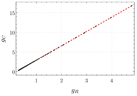 In order to uncover the space of physical parameters appearing in the (local sector of the) effective action of Equation (21), we have sampled the space of allowed deformations from the UV fixed point, and extracted the resulting IR values of the parameters in Equation (22) evaluating the flow of and for a suitably large RG time , exploiting the rapid convergence of the combination in Equation (19). The resulting values for , or equivalently , span a wide range of values, of the order of for the region of initial deformations that we have explored. Moreover, the closed-form flow that one obtains setting the classically marginal couplings to their fixed-point values spans the whole real axis [178]. We are thus led to conclude that the allowed (IR) values of are unrestricted. On the other hand, the values of and appear to lie on the line