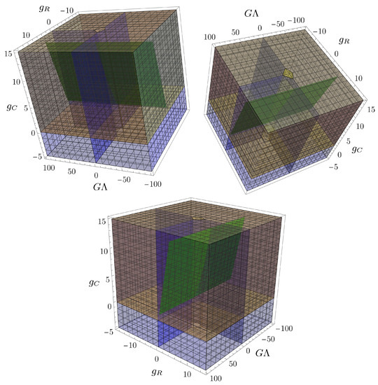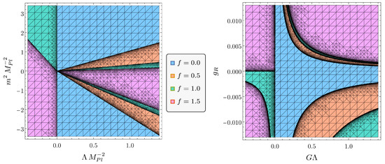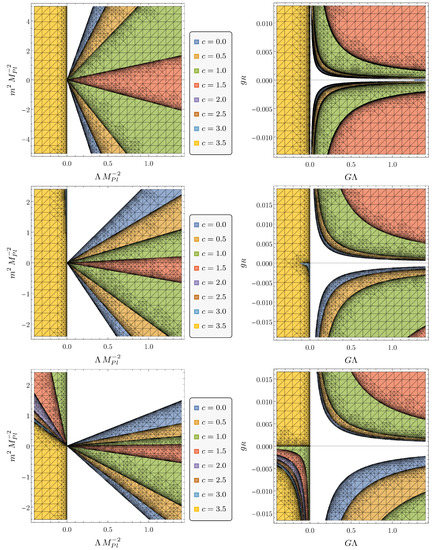 are allowed starting from any initial condition, i.e., any perturbation of the asymptotically safe UV fixed point along UV-attractive directions. To this end, we have evaluated numerically these combinations in the IR, implementing the substitution of Equation (19). The following plots highlighting the swampland constraints, the IR limits of asymptotically safe RG trajectories, as well as the final intersection between the allowed regions, will pertain to the theory space.