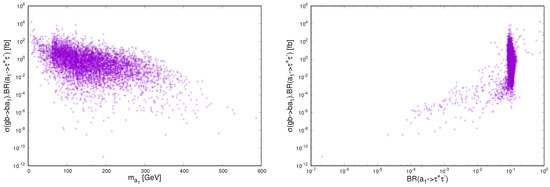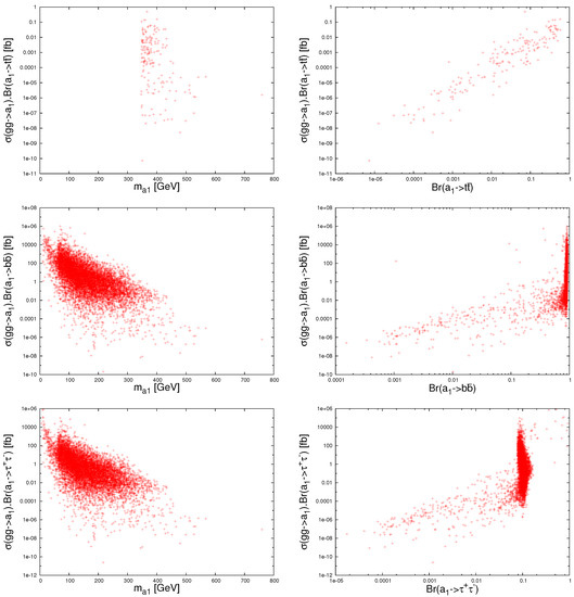 In this section, we consider the direct production of a light through the process in the context of the NMSSM rather than looking for its traditional production , which has been studied in the literature [42,43,44]. Figure 6 presents the production cross sections as functions of tan (top plot), (middle plot) and (bottom plot) for all the surviving points of the scan. We can see from the figure that the production rates are sizable, topping pb. These largest rates correspond to the region of large values of tan in which the is a light, GeV. The bottom plot of the figure shows the dependence of the production rates on the . It is clear that the population density of the points corresponds to the region of ∼10%. In summary, the production in bottom-quark annihilation in the tauonic decay channel at the LHC seems to be a promising production channel for the discovery of the light in the region of large values of tan. Some scope could also be afforded by signature in this production channel, see Ref. [108].