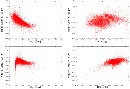 Figure 8 shows the correlations between and the lightest CP-even and CP-odd Higgs masses and for the good points. Since the surviving points emerging from the random scan have large values of and small values of both and , only small values of and are allowed, see Ref. [58]. It is remarkable to notice that in most regions of our parameter space the is the SM-like Higgs boson of the mass around 125 GeV. However, the can also play the role of the SM-like Higgs boson but only in small regions of the parameter space in which regions the is mostly singlet-like with mass GeV, see the left-plot of the figure, so it can escape the LEP, the Tevatron, and LHC bounds [109,110,111,112,113,114,115]. The right plot of the figure shows that the smaller the , the smaller the .