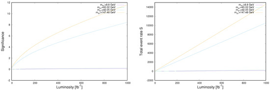 The signal significance (left plot) and the signal event rate S (right plot) of the process as functions of the integrated luminosity for the four benchmark points mentioned in Table 1. The lines for both = 8.8 GeV and 45.02 GeV may be hardly visible but they were added for clarity.