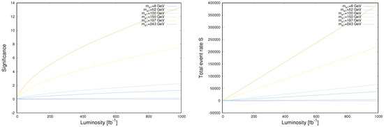 The signal significance (left plot) and the total event rate S (right plot) of the production process as functions of the integrated luminosity for the six benchmark points mentioned in Table 2.