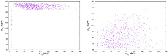 The mass distribution for the next-to-lightest CP-even Higgs, , versus the lightest CP-even Higgs mass (left plot) and versus the lightest CP-odd Higgs mass (right plot) [58].
