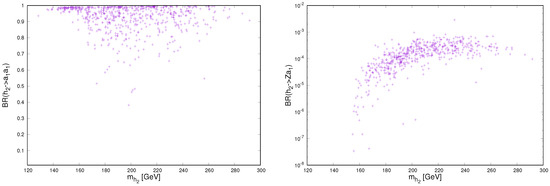 Due to the mixing between the Higgs singlet and doublets, Higgs-to-Higgs decays can be dominant over large regions of the parameter space if these decays are kinematically allowed. In Figure 9 we display the correlations between the decay rate and the (left) and the correlations between the decay rate and the (right). It is clear from the left plot of the figure that the decay is dominant, reaching unity, whenever it is kinematically allowed. The dominance of this decay mode causes a suppression of the other decay channels such as . It is also noticed that the branching ratio is quite small, topping 0.1% as shown from the right plot of the figure.