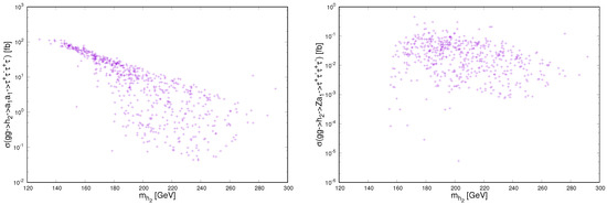 In Figure 2, we show the total production cross sections for the and channels as functions of and of the corresponding branching ratios and . One notices in the figure that the production rates reach up to about several hundreds fb for and several tens fb for final states. Such high rates correspond to GeV. This is interesting as such signal events could be detectable particularly at very large luminosities of the LHC. Interestingly, one also notices in Figure 3 that the and can reach unity in certain regions of the NMSSM parameter space. The reason for such dominant decay channels is that the is a singlet-like with suppressed couplings to fermions at the tree level but the can couple to and at one loop with charginos in the loop. In this case, the mixing angle gets close to 0, see Equation (8). Unfortunately, one cannot take advantage of this phenomenon because even if the couplings to and are enhanced but its couplings to gluons in the production channel are suppressed so the production cross sections are quite small when the and the , see the right plots of Figure 2. The enhancements of the partial widths of and are characteristic features of the NMSSM in comparison to the MSSM.