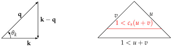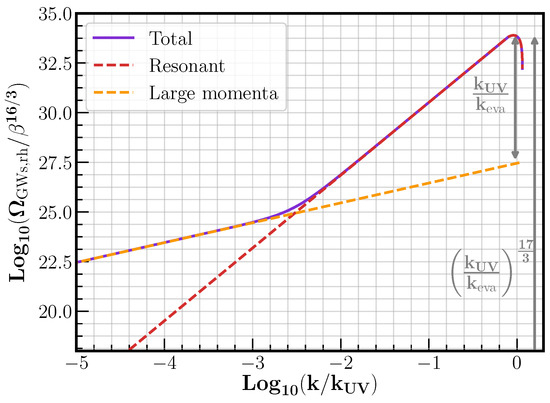 Looking closely at Equation (19), we might suspect that there could be a resonance if the wavenumber k of a tensor mode approaches that of twice the scalar mode . This resonance may be understood in two ways. First, we know that a harmonic oscillator with an external force has a resonance when the period of the force matches that of the harmonic oscillator. If that occurs, the amplitude of the oscillations diverges in time. In short, the external force is kicking the oscillator at the right times. The second way to see it is that two scalar modes with physical momentum have a preferred window to produce a tensor mode with physical momentum equal to twice the scalar momenta, i.e., , if allowed by momentum conservation. To see this mathematically, let us redefine the tensor modes in Equation (19) to remove the Hubble friction by