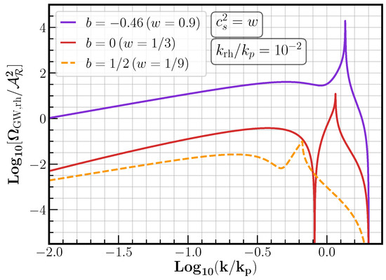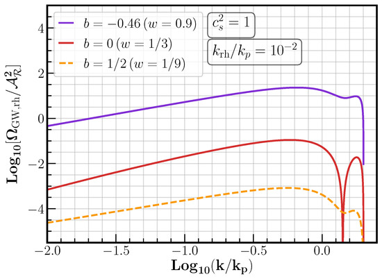 The intuitive physical picture behind (22) is the following. In a universe with constant b, modes of a massless field (e.g., the tensor modes or the scalar field ) which enter the horizon early get more diluted than modes which enter later. For example, consider that right after horizon crossing, i.e., when , we have that the energy density of the massless field starts to dilute as . Since we have that then and . Thus, if the IR tail of induced GWs in radiation domination goes as , we expect due to dilution [78]. However, as we have shown, this is incomplete for induced GWs from a peaked spectrum. For , the density fraction of the scalar field grows as . This means that induced tensor modes which are generated later have a larger source and a larger amplitude than those generated earlier. In other words, for small k have a larger amplitude than large k by a factor . Then, for the density fraction of induced GWs goes as [74]. This gives the general formula that we derived in (22). Whether this absolute value of b is unique to induced GWs is something yet to explore.