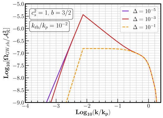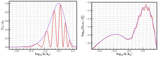which is in agreement with the general results of Ref. [78]. These naive derivations will be later recovered from the analytical formulas in Section 4. It is interesting to see that for () the induced GW spectrum peaks at which is clearly different than the peak in the primordial spectrum at .