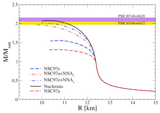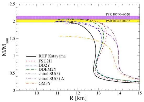 - Schulze, H.J.; Riken, T. Maximum mass of hyperon stars with the Nijmegen ESC08 model. Phys. Rev. C 2011, 84, 035801. [Google Scholar] [CrossRef]