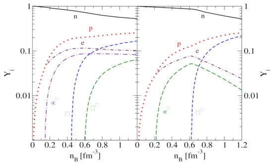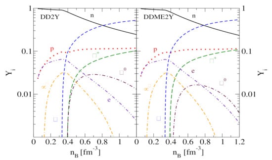 Particle composition () as a function of the baryonic density of DD2Y model [] (left panel) and DD2MEY model [] (right panel). See text for details.