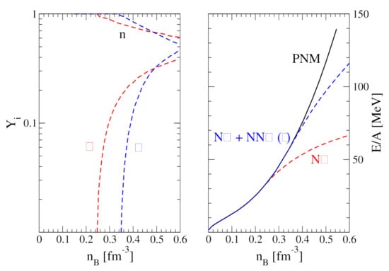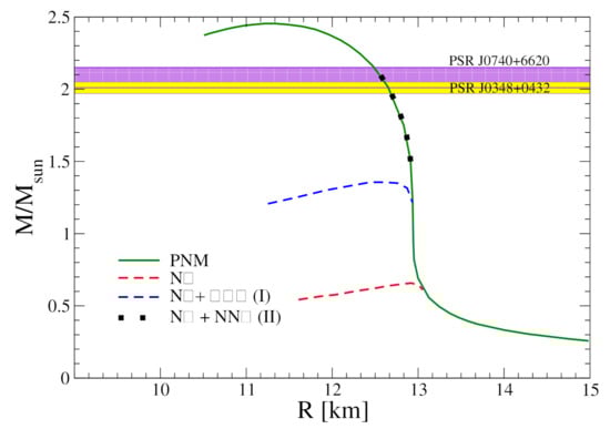 I will end this part of the review focused on the neutron star structure predicted by microscopic approaches, discussing the attempt to include hyperonic degrees of freedom in the framework of the Dirac-Brueckner-Hartree-Fock approach. The Dirac-Brueckner-Hartree-Fock approach [,] is, in a way, an extension of the non-relativistic Brueckner-Hartree-Fock one. In the relativistic framework, the self-energies and interactions of the various particles are calculated according to the solutions of the Dirac equation in the HF approximation. In the last ones, the bare nuclear masses are replaced by effective masses, which can be calculated in a self-consistent way, therefore acquiring a strong in-medium effect. One of the main advantages of this approach is that the effect of a certain class of three-body forces is effectively included at the two-body level. This particular class of three-body forces takes into account the nucleon-anti-nucleon pair formation in the medium. This mechanism is able to provide good saturation properties of nuclear matter and a stiff nucleonic EOS able to support a two solar mass neutron star [] at the nucleonic level. The first attempt to include hyperonic degrees of freedom in the DBHF framework has been reported by Sammarruca in Ref. [], considering the effect of fixed hyperonic concentrations on the energy per particle of the system, and employing the Ju04 NY interaction. To the best of my knowledge, the only calculation of -stable hadronic matter, in this framework, has been carried out by the authors of Ref. [] who, using an effective NY interaction, showed that the repulsive mechanisms that account for the stiffness of the EOS at the nucleonic level, act in a similar way in the hyperonic sector. This repulsive mechanism, therefore, seems able to produce a large mass neutron star in agreement with observations.