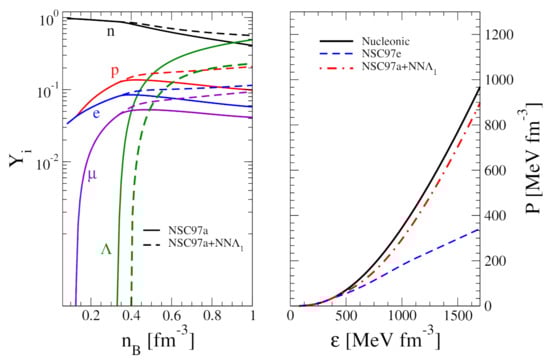 The composition of -stable neutron star matter according to this model is shown in the left panel of Figure 6 for the models NSC97a and NSC97a+ NN. Qualitatively similar results were obtained by employing the other NY and NNY interactions. The continuous lines show the results when only N, in addition to NN and NNN forces, are taken into account, whereas the dashed ones also include the contribution of the NN force. The effect of the latter is twofold. First, it shifts the onset of the -hyperon to slightly larger baryonic densities. The second effect, may be the most important one, is that the NN force strongly reduces the abundance of particles at large baryonic densities leading to a stiffening of the EOS comparing to the case in which the NN force is not included. This can be appreciated in the right panel of Figure 6, where the total pressure P is reported as a function of the total energy density . Consequently, the mass of the neutron star, and in particular its maximum value, increases. This is shown in Figure 7, where the mass-radius relation is reported for the models NSC97a and NSC97e, with and without the inclusion of the NN force. The black line corresponds to the case of pure nucleonic matter included as reference. It is remarkable that the maximum masses obtained, including the NN force are compatible with the largest measured masses of ∼[,,]. An additional interesting feature found in Ref. [] is that the overbiding of the separation energies in heavy hypernuclei found using the sole N interaction in microscopic calculations [,], is strongly reduced, adding the NN or the NN interactions. These results are consistent with the findings of Refs. [,].