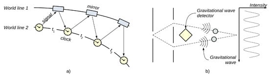 where c is the speed of light. Although there have been concerns that his two-dimensional spacetime picture might be “too narrow” to conclude that Equation (1) holds generally [43], we use his derivation as it appears in the original paper after cross-checking it; it appears sensible within his specific constrained 2D setup, with the caution that it may not be a general result. Extending his argument to a non-flat metric and using the same measurement principle (clocks and light rays, first clock moving along a geodesic), he shows how the components of the Riemann curvature tensor can be directly inferred from measurements of time. For instance, one obtains