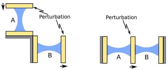 An alternative path to understanding why GW fields in the vacuum state lead to purely quantum effects detectable in principle using interferometers is outlined in Figure 2. On the left drawing, two Fabry–Pèrot cavities are set up with orthogonal axes. A + polarized GW propagating orthogonally to the cavities’ axes then induces quadrupolar motion of the cavities end mirrors according to the indicated arrows. Generalizing (29), the relevant Kerr-like term is approximately of the following form: