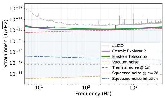 In Figure 3, the strain noise for the advanced LIGO detector (aLIGO) [102] as well as the future Cosmic Explorer 2 [103] and Einstein Telescope [104] experiments is plotted. In the same plot, we show the undetectably small strain noise corresponding to quantum vacuum fluctuations of the gravitational field [24] (lower dashed orange line) as well as the expected strain noise for a thermal background of gravitons at , the expected current temperature for the cosmic gravitational wave background [95]. Even though the PSD associated with thermal GW states have an enhancement factor of , which yields a noise orders-of-magnitude higher than vacuum fluctuations, the effect is still below the expected sensitivity of future experiments. Squeezed states, on the other hand, present an exponential enhancement factor in the squeezing parameter, namely . This raises the expectation that significant quantum fluctuation effects could be detected in gravitational wave astronomy. The squeezing parameter r is related to the mean number of quanta in a squeezed state according to [105],