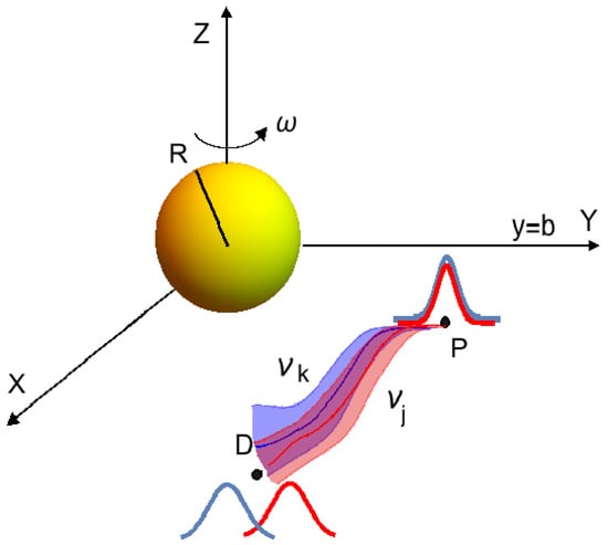 Following [,], we can now consider a first approximation in which the neutrinos propagate along a direction parallel to the x-axis with impact parameter (Figure 1). This implies that in Equations (34) and (36). Furthermore, since the metric (31) does not depend on t, the component is a constant of motion, corresponding to the neutrino energy as measured by an inertial observer at rest at infinity (asymptotic energy). The local energy, which is the quantity actually measured by an observer at rest at finite radius in the gravitational field [,,], is related to through the transformation law that connects the local Lorentz frame to the general frame