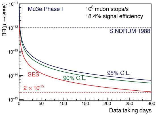 Mu3e is realized in a two-stage approach: the first experimental phase (Phase I) uses the existing beamline at PSI, the world’s most intense muon beam, which provides up to stopped muons on target per second. These muons come from stopped pions decaying at rest close to the surface of the production target. As negative pions are immediately absorbed in the target and do not decay into muons, it results in a very intense and pure positive muon beam. Phase I is foreseen to start physics operations in 2024 and it is designed to reach a single event sensitivity (SES) on the branching fraction of after a running time of around 290 days, as shown in Figure 2. The second phase (Phase II) aims for a single event sensitivity. It requires a novel beamline, the High intensity Muon Beamline (HiMB) [1,7], capable of delivering muons on target per second, which is planned to be available at PSI starting 2028.