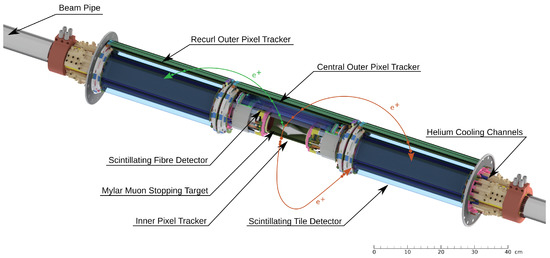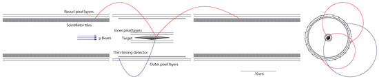 Given the low energy regime (below ∼50 MeV) and the very high magnetic field, the electrons/positrons recurl back following a helical trajectory, also known as a recurling track, either crossing the central tracker again or hitting the outer tracking stations, as shown in Figure 4. At these energies, the Coulomb scattering in the detector material is the main contribution to the degradation of the momentum resolution. The detector design, therefore, is conceived to minimize multiple scattering effects on the recurling tracks. This can be achieved with a long narrow tube, where the radius is optimised to the chosen magnetic field [1].