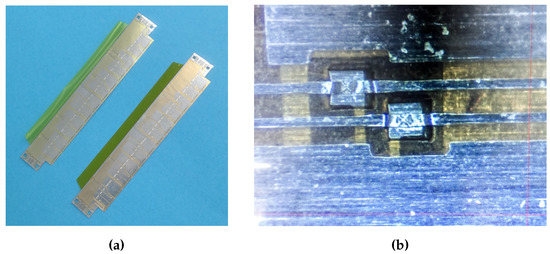 Another key study to prove the feasibility of the Mu3e tracker concept has been performed with thermo-mechanical mockup prototypes. This is a reproduction of the tracker itself made with passive components and temperature monitor circuitry. The aim is to match the material and power consumption of the final detector, to prove its mechanical stability and the performance of the cooling system. Two series of prototypes have been produced: the tape heater ladders and the silicon heater ladders. The first are made of thick stainless steel dummy chips attached to aluminium-polyimide laminate resistive heating circuits (see Figure 9a). The circuits are laser-cut and are made to match the ladders final size. The silicon heater ladders are made of thick silicon heater chips spTA-bonded to HDIs. The silicon heaters are equipped with circuits for temperature reading, while the HDIs are produced with the same technology as in the final experiment (see Figure 9b). These ladders, therefore, closely match the material stack of the final detector, and the manufacturing steps to produce them are the same as for the detector fabrication.