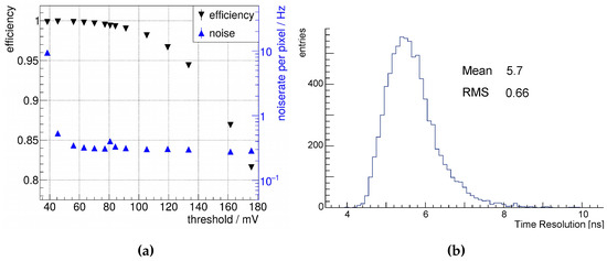 The efficiency and time resolution of MuPix sensors have been investigated in several test beam campaigns at DESY and PSI with electrons and pions respectively. There, the prototypes have been exposed to a high energy particle beam, while the particle tracks have been reconstructed with a pixel telescope. By matching the telescope tracks with the prototype’s hit, the efficiency can be calculated for every pixel. At the same time, the pixel noise can be extrapolated from hits that are not associated with any track (see Figure 8a). These results show that the sensors meet the Mu3e efficiency and noise requirements in a threshold range of about 40–90 mV, corresponding to about 650–1450 electrons.