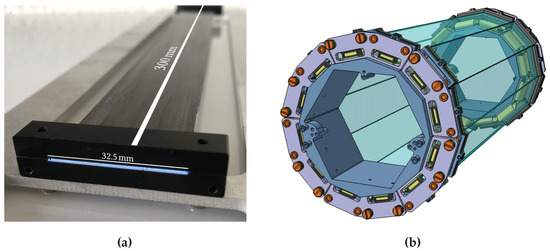 Fibers are grouped together in the so-called ribbons, shown in Figure 10a. Each ribbon consists of three staggered layers of 128 fibers each. The exact number of layers was found the best compromise between detector efficiency and multiple scattering effects. The fibers are assembled with Polytec EP 601-Black epoxy, which is a two-component, low viscosity, black-colored adhesive with excellent handling properties. The fiber detector is composed of a total of 12 of these ribbons, each 300 mm long and 32.5 mm wide. The ribbons are mounted in a roughly cylindrical shape, as shown in Figure 10b. They are staggered longitudinally with respect to each other by about 10 mm to minimize dead spaces between the ribbons and ensure full coverage and high efficiency. With a radius of 6 cm, the SciFi detector is positioned just inside the third silicon layer, sufficiently close to it for an optimal track finding and sufficiently far from the target to minimize occupancy.