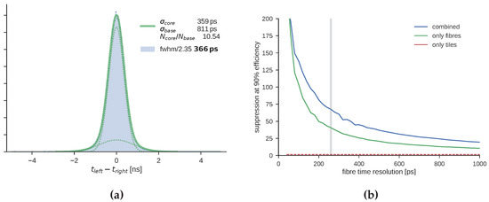 (a) Time resolution of a SciFi ribbon defined as the difference between the time measured on both sides. The global time resolution is defined as ps. (b) Suppression of accidental background as a function of the fiber detector time resolution if only the fiber detector (green) is used or both timing detectors (blue) are used. The tile detector alone has no suppression power [1].