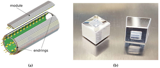 (a) Lateral layout of the tracker’s central station. (b) CAD drawing of the Mu3e tracker’s mechanical components. The violet stripes are parts of the electrical connections, which are integrated in the module mechanics [1].