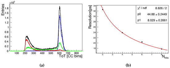 (a) Energy deposition in a scintillator tile (black), composed of a Landau peak (blue), a plateau arising from edge effects (green) and a peak from optical cross-talk (red), as obtained from data by applying different geometrical cuts. The unit “CC bins” corresponds to the coarse counter bins above a certain threshold as computed by the readout chip (see Section 4.3). (b) Time resolution as a function of the number of hits per cluster. The fit is parametrized as [1].