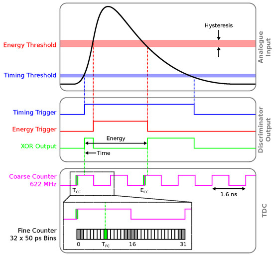 Figure 14 shows a sketch of the MuTRiG working principle. The analogue signals from SiPM are discriminated by a lower “time” (T) and an higher “energy” (E) thresholds. The ASIC digitizes the rising edge at the lower T-threshold and the time of the falling edge at the higher E-threshold into a T- and an E-timestamp, respectively. The T-timestamp corresponds to the signal’s time of arrival, while the difference between the two timestamps provides a linearized time-over-threshold. The T-threshold can be adjusted around the single photon level, whereas the E-threshold covers a much larger range up to typical SiPM saturation levels.