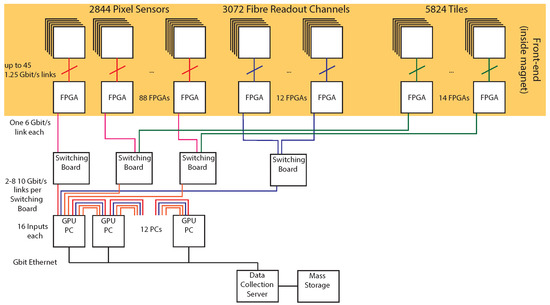 The Mu3e data acquisition system (DAQ) [15] works in continuous mode, i.e., without a hardware trigger. This implies that all subsystems continuously send zero-suppressed data. A sketch of the Mu3e DAQ is drawn in Figure 15.