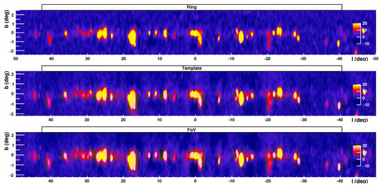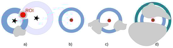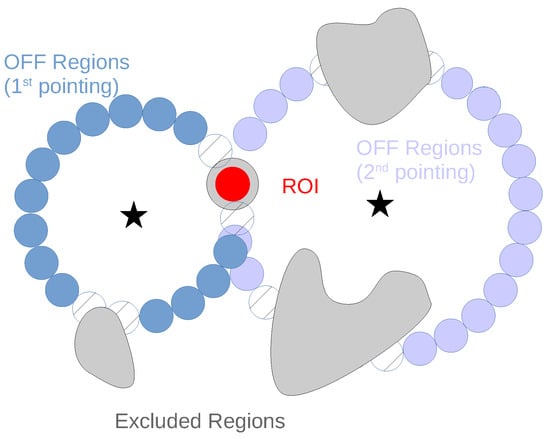 - The ring can be constructed around the ROI in the astronomical frame (equatorial, galactic, …, Figure 12b–d), and then uses the stacked data set, instead of individual runs to generate sky maps. The determination of the energy spectrum of the source is, however, very challenging in this version, because the ring around the ROI encompasses many different runs, corresponding to different observational conditions which need different response functions. The ring background can, however, be performed in energy slices (thus requiring the acceptance to also be determined in energy slices).