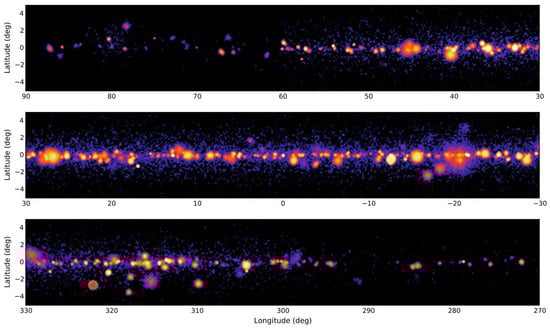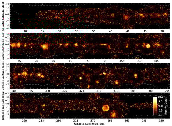 - Abdalla, H. et al. [H.E.S.S. Collaboration] The H.E.S.S. Galactic plane survey. Astron. Astrophys. 2018, 612, A1. [Google Scholar] [CrossRef]