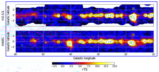 - Abdalla, H. et al. [H.E.S.S. Collaboration] [HAWC Collaboration] TeV Emission of Galactic Plane Sources with HAWC and H.E.S.S. Astrophys. J. 2021, 917, 6. [Google Scholar] [CrossRef]