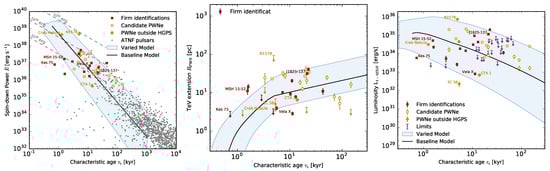 - Abdalla, H. et al. [H.E.S.S. Collaboration] The population of TeV pulsar wind nebulae in the H.E.S.S. Galactic Plane Survey. Astron. Astrophys. 2018, 612, A2. [Google Scholar] [CrossRef]