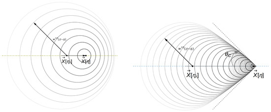 with . From this perspective, a strictly supersonic source sweeps out a worldline (or world-tube) whose tangent vector(s) is spacelike with respect to the right hand side of Equation (5) everywhere along its spacetime trajectory. That is, ; or, in terms of the coordinate system, . Whereas a strictly subsonic source is timelike with respect to the right hand side of Equation (5).