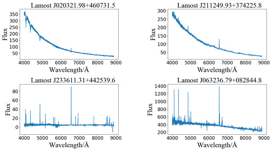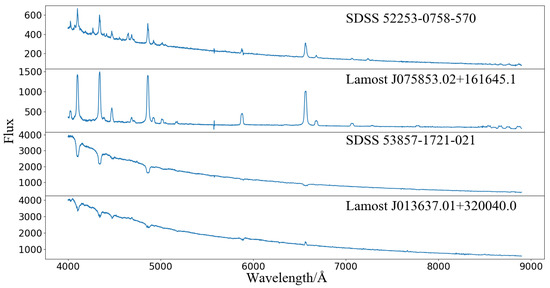 The Large Sky Area Multi-Object Fiber Spectroscopic Telescope (LAMOST), which was designed and constructed by Chinese scientists, is a 4 m quasi-meridian equipped with a 4000-fiber reflective Schmidt telescope. Owing to its scientific design, the LAMOST can observe up to 4000 targets per exposure [28,29,30,31]. At present, the spectral data released by the LAMOST are more than the sum of the spectral data released by other optical telescopes in the world, making the LAMOST the telescope with the highest spectral acquisition rate in the world [32]. LAMOST-DR7 was released to astronomers in March 2020, which covers 4926 low-resolution observation areas and 10.6 million low-resolution spectra. These spectra provide data sources for searching for special and rare objects. In this study, the experimental data comprise more than 10 million spectral data, including stars, galaxies, QSOs, and unknown objects from 4926 regions of LAMOST-DR7 low-resolution observations. The distribution of the LAMOST spectra is shown in Table 1.