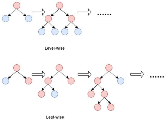 - Leafwise growth [27] algorithm: Traditional decision trees such as XGBoost [37] grow levelwise, in which the leaf nodes in the same layer are split at the same time and then pruned. This splitting mode causes much unnecessary computational consumption. LightGBM uses leafwise growth. The model searches for the node with the maximum gain among all the current nodes every time and then splits and iterates repeatedly until the decision tree is completely generated. Leafwise is more efficient than levelwise, but easily generates too deeply, which leads to overfitting. If the decision tree does not have a max depth limit, the tree will continue to split. Under the same number of splits, the decision tree will more deeply generate with leafwise growth. Excessive splitting of the decision tree will make the model learn the information that is not important for the classification, thus reducing the accuracy of the classifier. The algorithm needs to control the maximum depth of the tree to reduce the risk of overfitting. The two algorithms are shown in Figure 2;