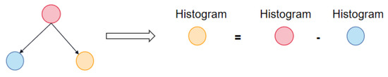 - Acceleration of histogram differences: LightGBM accelerates the training process by using the differences of the histograms while constructing them. When splitting, the histogram of the current node is represented by the difference between the histogram of the parent node and the sibling node. This type of acceleration greatly improves the training speed and efficiency [38]. The schematic is shown in Figure 3.