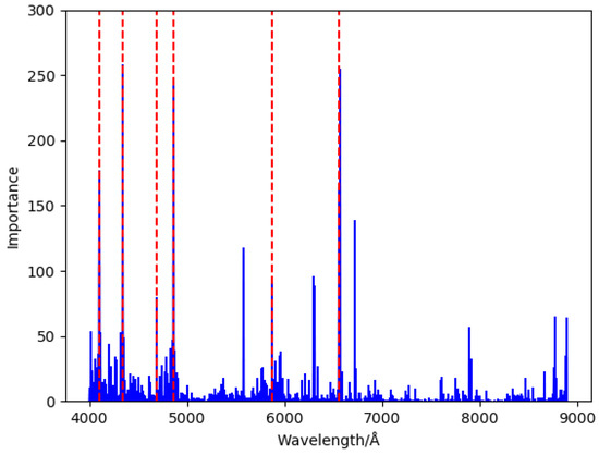 Importance of features. The blue solid lines represent the importance of each wavelength; the red dotted lines represent the wavelengths of the Balmer lines and He lines.