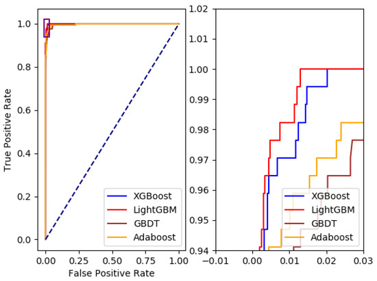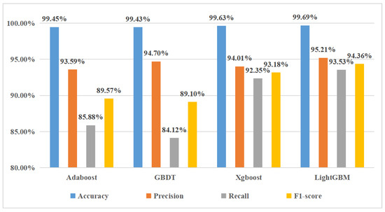 In this paper, we also trained the AdaBoost [39], GBDT [40], and XGBoost models based on the same training set and tested them on the same test set for the comparison with the LightGBM model. The comparison result is shown in Figure 5.