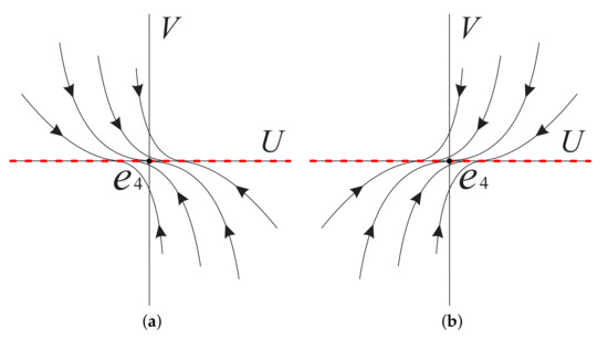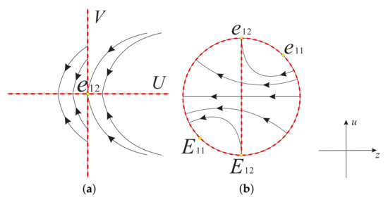 On the local chart we only need to study the origin of system (11). Obviously is an equilibrium point. Since its linear part is identically zero, we cannot use the usual eigenvalue method to determine the type of the equilibrium point and its local phase portrait, but we note that the straight line of system (11) is full of equilibrium points, and if the common factor V in system (11) is eliminated, there are no other equilibrium points in . When , on the positive semi-axis of V, indicates that V decreases monotonically, and on the negative semi-axis of V, means that V increases monotonically. Near the straight line , , U increases monotonically when , and U decreases monotonically when . Therefore, the local phase portrait of the equilibrium point of system (11) is shown in Figure 1a when . Similarly, the local phase portrait of is illustrated in Figure 1b when .