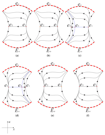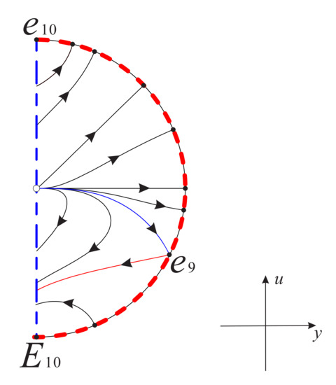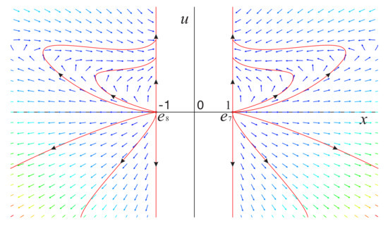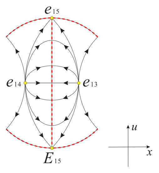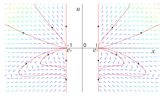 Note that ; thus, for the case , system (16) admits two equilibrium points and . In addition we also note that system (16) is symmetric with respect to u-axis under the symmetry , so we only need to discuss the equilibrium point . However, the functions on the right side of system (16) have no derivative at , which means that the local dynamics near cannot be studied by the methods in the previous Section 3.1.1 and Section 3.1.2. When , the first equation in system (16) is always equal to zero, and the second equation is simplified to , i.e. on the invariant straight line the solution is (c is an arbitrary constant), which indicates that tends to infinity in forward time and leads to in backward time.